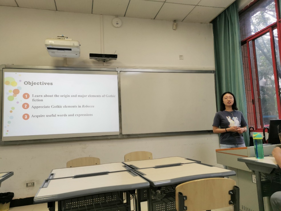 本次教研室活动分两个环节。第一个环节由新进博士蒋展就《英文经典选读(1)》阅读材料 Rebecca (《蝴蝶梦》)的处理以说课方式进行了演示。蒋展详细讲述了本次课堂教学的教学目标和具体教学实施步骤。教研室全体教师针对蒋展的说课各环节提出了中肯的意见和建议,并就小说要素的概念、哥特式小说及教学活动设计展开了热烈的讨论。