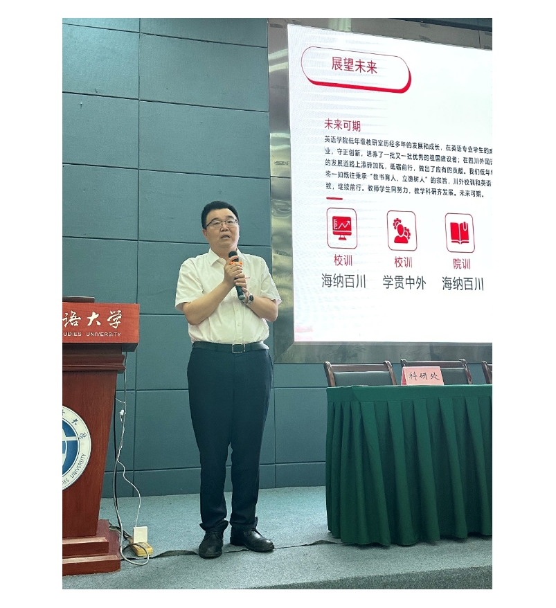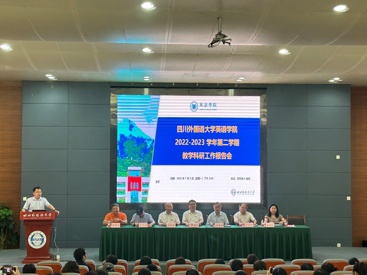 20237月3日下午3:00-6:30,英语学院在歌乐楼A栋学术报告厅顺利举行2023年度教学科研工作报告会。四川外国语大学校长董洪川、副校长祝朝伟、副校长王仁强、副校长严功军、教务处处长刘玉梅、研究生院院长(学科办主任)胡安江、科研处处长王伟以及英语学院全体教职员工参加了本次报告会会议由英语学院院长赵永峰持。