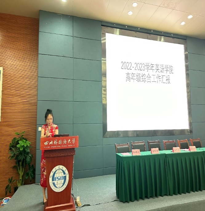 随后高年级教研室负责人责人邱梦颖就高年级各教研室本学年相关工作进行了简要汇报。邱梦颖从科研成果、2023年专业八级备考及学院近三年专八考试成绩分析、实践周活动、教师发展、教师指导学生获奖、教师自身参赛获奖、各级课程、教改项目、本科生毕业论文和新培养方案中2021级各个方向班级分布、课程设置方面总结了高年级教研室一年来的工作。