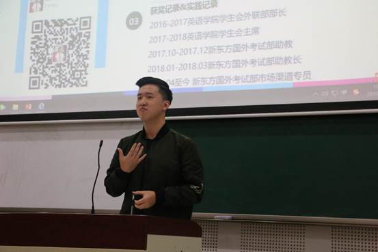 随后,已获得新东方市场部工作的屈金源学长讲述了多段个人经历,为在场学弟学妹提供就业借鉴。屈金源借助自己做新东方助教兼职的实例,鼓励同学从理想公司的基层工作做起,了解企业文化,接触优秀人才,为将来就业发展打下坚实基础。“明确目标,相信过程”是他就业中至关重要的信念。最后,他还向即将面对就业问题的学弟学妹表达了美好期望。