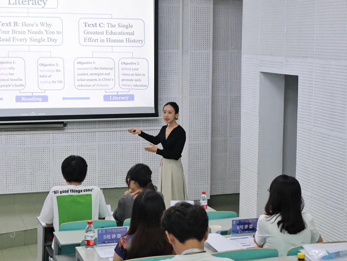 经过复赛的激烈角逐,英语专业组有4名参赛教师进入决赛,商务英语专业组有3名参赛教师进入决赛。决赛阶段的比赛由说课、回答评委提问两个部分组成。决赛说课内容由大赛全国组委会指定选文,决赛赛区准备时间30分钟。参赛教师须紧扣材料进行说课,时间不得少于7分钟,且不得超过10分钟;说课结束后,由评委提问,时间不超过5分钟。