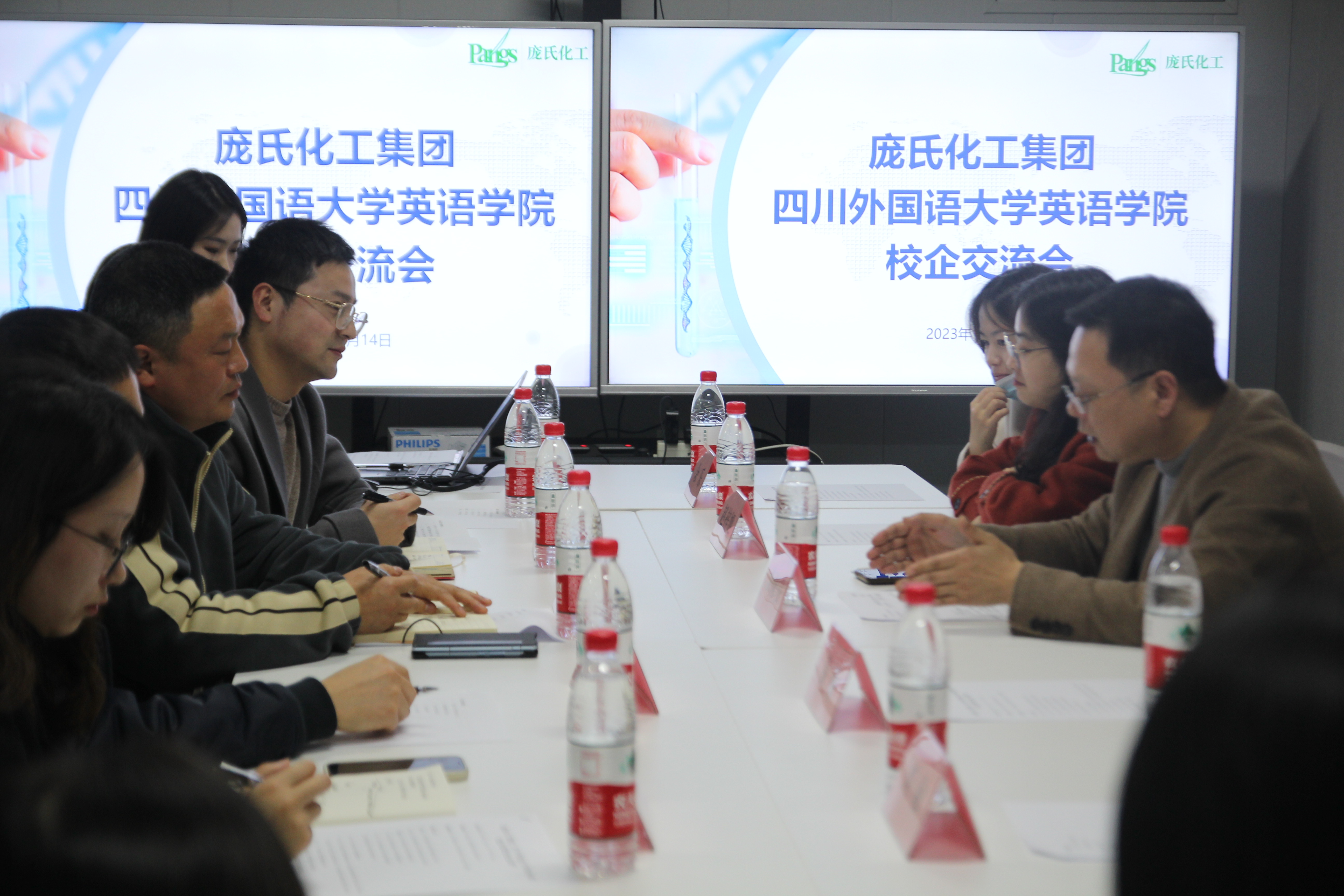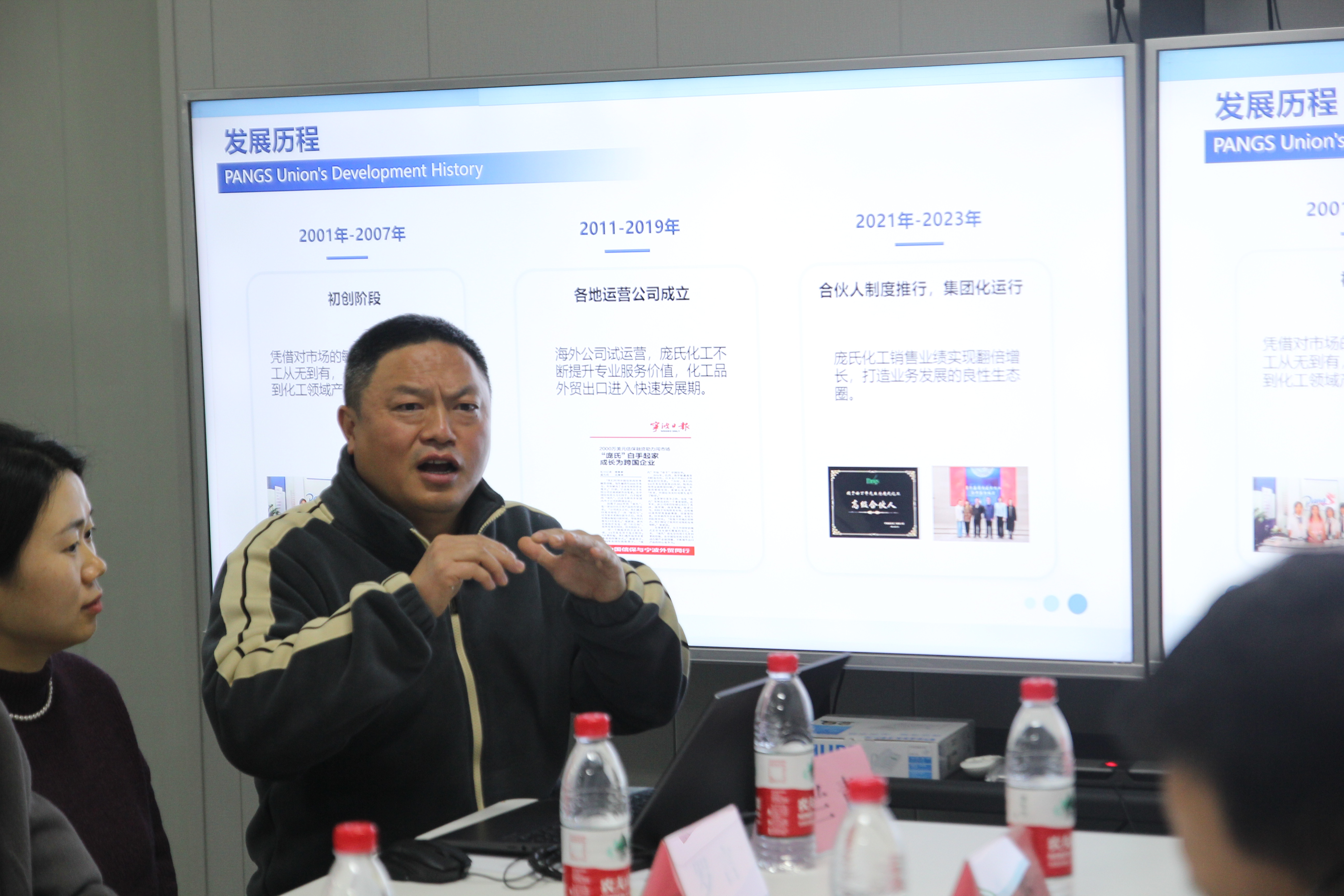 2023年12月14日下午,四川外国语大学英语学院党总支书记淡修安、英语学院党总支副书记秦丽、2020级辅导员刘敏、余乐、赵梓旭带领英语学院学生代表走访了庞氏化工集团重庆分公司。 庞氏工作人员首先带领英语学院师生参观了公司并进行了友好座谈。庞氏化工集团董事长庞斌结合庞氏二十多年的发展历史、规模现状及前景展望介绍了公司。