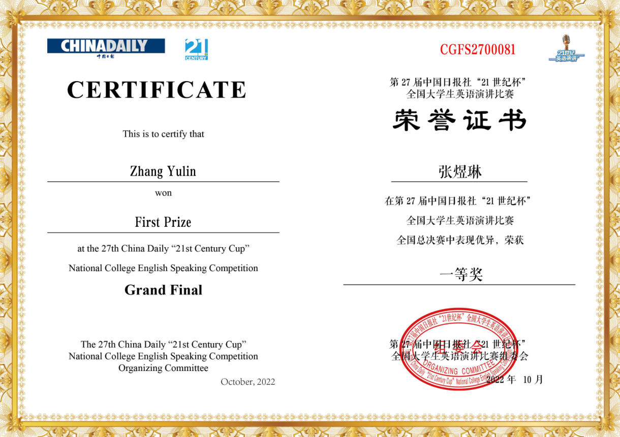 第27届中国日报社21世纪杯全国大学生英语演讲比赛全国总决赛 |